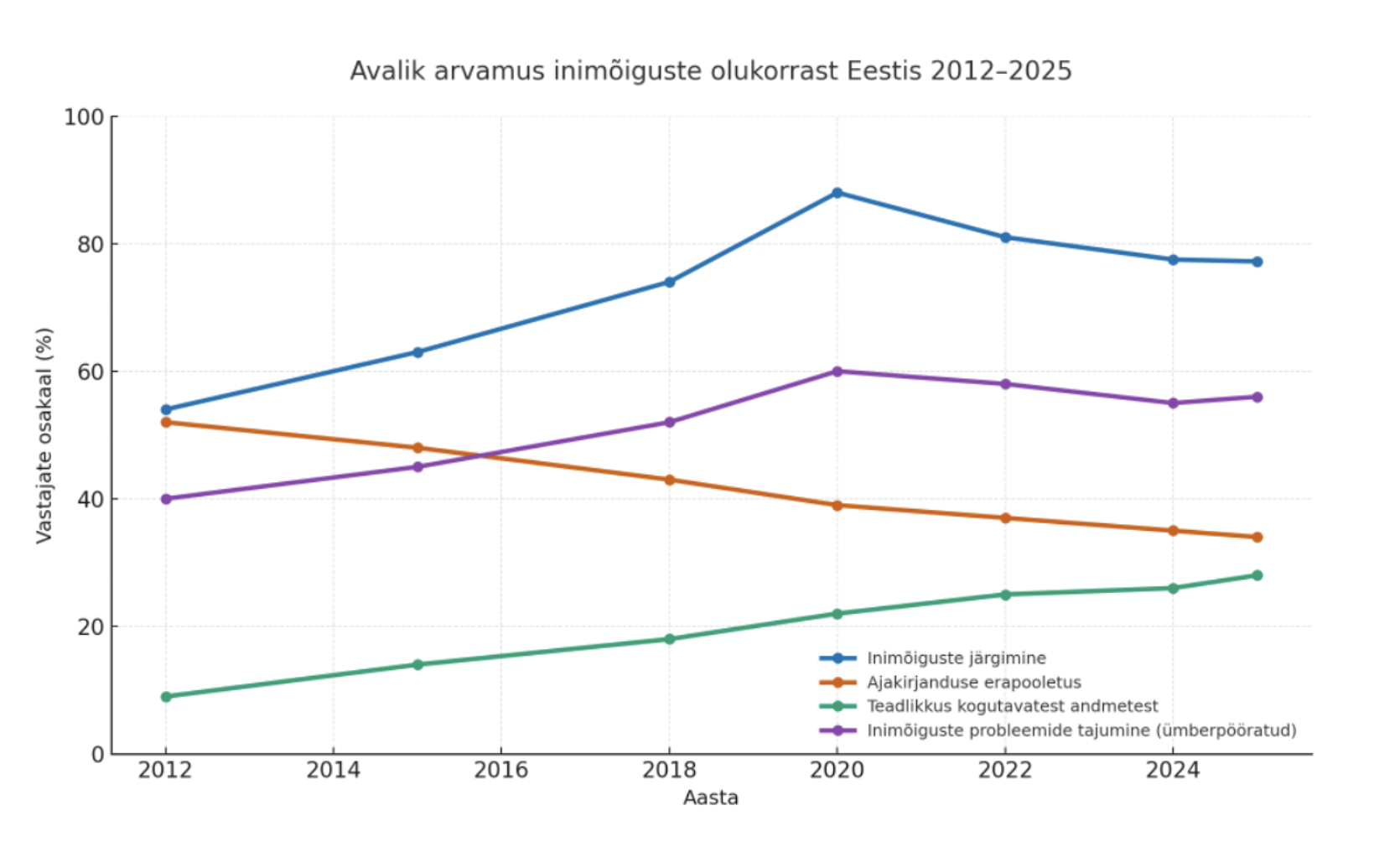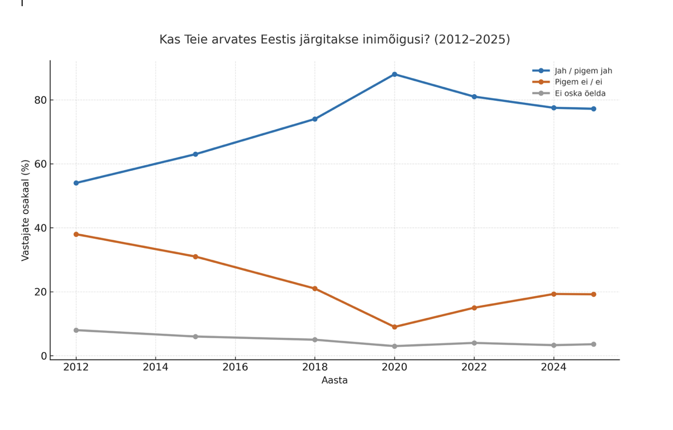 Joonis näitab, kuidas aastatel 2012–2025 on muutunud Eesti elanike hinnang küsimusele „Kas Teie arvates Eestis järgitakse inimõigusi?“